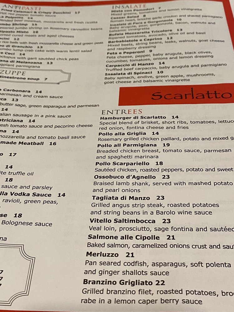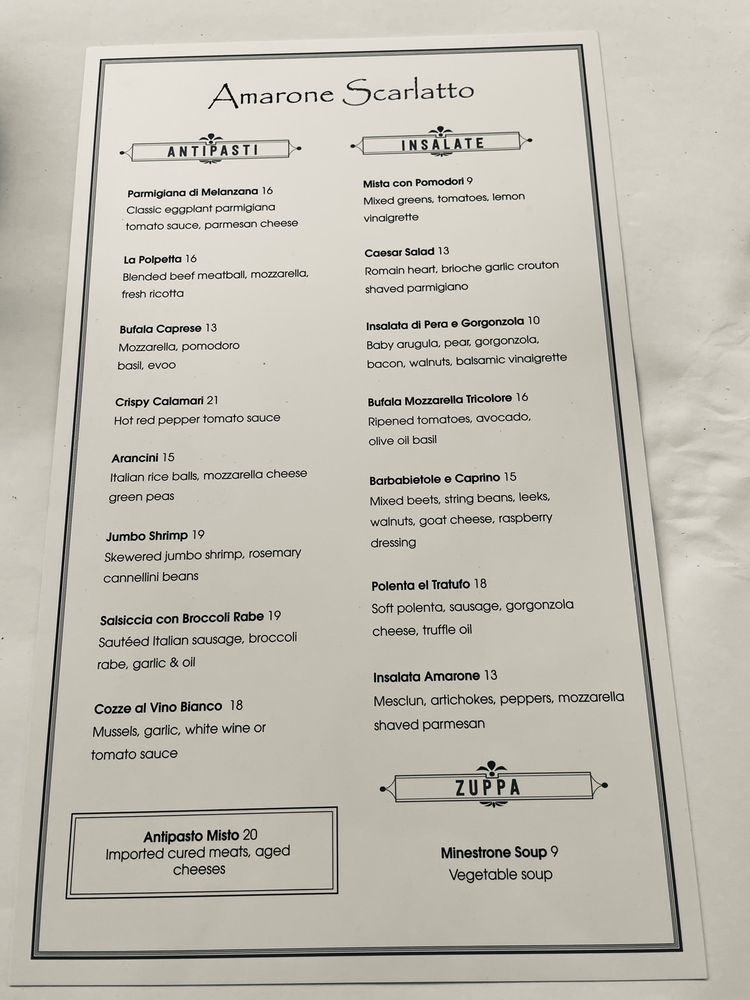Introducing the menu at Amarone Scarlatto, an Italian gem located at 686 Ninth Ave in New York City. This cozy restaurant offers a range of traditional Italian dishes with a casual and romantic ambiance. From the crispy Fried Calamari to the flavorful Jumbo Shrimp Skewers, the Antipasti menu is bursting with bold flavors. Pair your meal with the hearty Minestrone Soup or a fresh Caesar Salad for a delightful start. Indulge in the Insalate options like the Bufala Mozzarella Tricolore showcasing ripe tomatoes and creamy mozzarella. With options for outdoor seating, delivery, and takeout, Amarone Scarlatto provides a versatile dining experience. Don't miss out on their signature dishes and charming atmosphere - call (212) 730-4535 to make a reservation today.